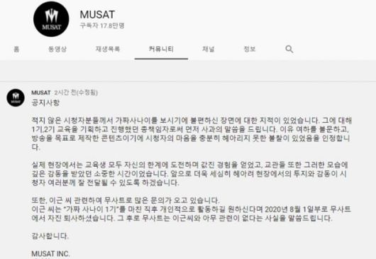 무사트 공식입장  / 사진 = 무사트 유튜브 화면 캡처