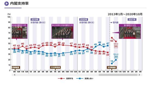 출범 초기 고공행진을 하던 스가 요시히데 일본 내각의 지지율이 50%대로 하락했다.