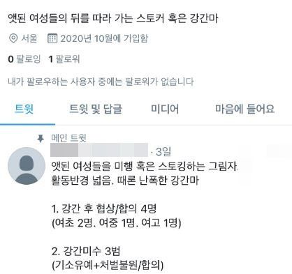 작성자는 자신을 ‘앳된 여성들을 미행 혹은 스토킹하는 그림자’라고 설명하며 ‘강간 미수 3범, 강간 후 협상·합의 4명’ 등이라는 소개 글을 남겼다.
