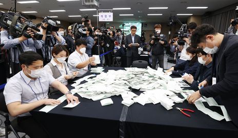 지난 5월 경기도 과천시 중앙선거관리위원회 대회의실에서 선관위 직원들이 언론을 상대로 '투·개표 공개 시연회'를 하고 있다./조선DB |