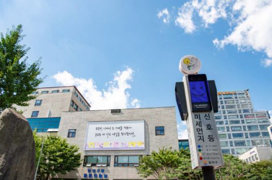 9월 22일 서울 양천구 양천공원 인근에 위치한 미세먼지 신호등이 청명한 가을 하늘과 같이 푸른빛으로 웃으며 미세먼지 농도 좋음 상태를 알리고 있다. 사진=양천구 제공 |