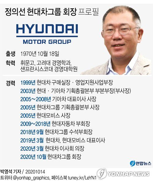 2018년 현대차 부회장에서 그룹 수석부회장으로 승진한 정 신임 회장은 작년 3월 현대차와 현대모비스 대표이사를 맡고 올해 3월 현대차 이사회 의장에 오르며 사실상 그룹 경영 전면에 나섰다.