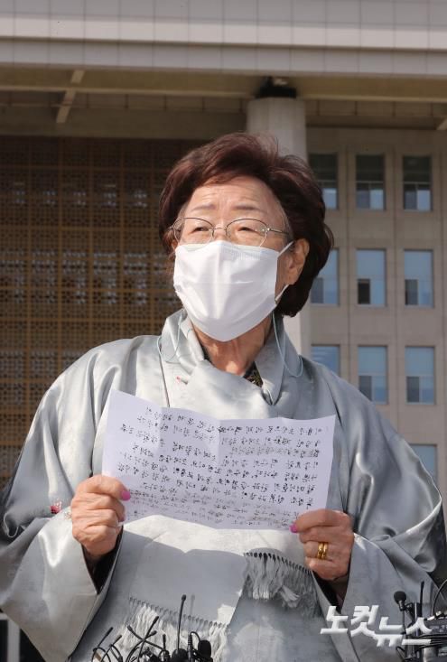 일본군 위안부 피해자 이용수 할머니가 14일 오후 서울 여의도 국회 본청 앞에서 독일의 '평화의 소녀상' 철거 명령 철회 촉구 기자회견을 하고 있다.