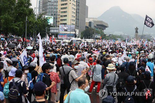 지난 8월 15일 오후 서울 종로구 동화면세점 앞에서 '문재인 정권 부정부패·추미애 직권남용·민주당 지자체장 성추행 규탄 집회'가 열리고 있다. [연합뉴스 자료사진] |