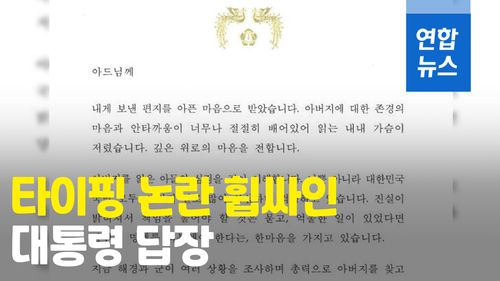 문 대통령은 "아드님께"로 시작한 편지에서 "아버지에 대한 존경의 마음과 안타까움이 너무나 절절히 배어 있어 읽는 내내 가슴이 저렸다"며 "진실이 밝혀져서 책임을 물어야 할 것은 묻고, 억울한 일이 있었다면 당연히 명예를 회복해야 한다는, 한마음을 가지고 있다"고 밝혔습니다.