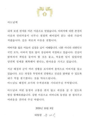 (서울=연합뉴스) 김수진 임형섭 기자·이율립 인턴기자 = 문재인 대통령이 북한군에 사살된 해양수산부 공무원 A씨의 아들에게 보낸 답장 편지의 서명이 친필이 아닌 전자 서명이라는 점이 입방아에 오르고 있다.