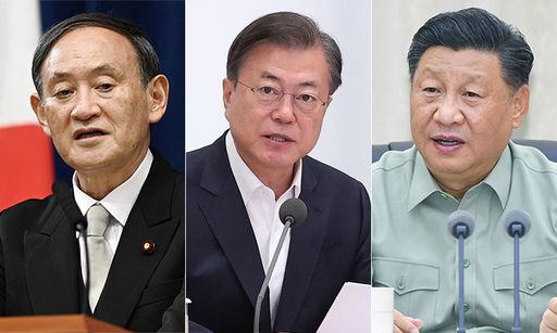 스가 요시히데 일본 총리(왼쪽부터), 문재인 대통령, 시진핑 중국 국가주석. 연합뉴스 |