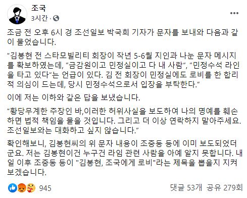 조국 전 장관은 박 기자가 자신에게 “김봉현 전 회장이 작년 5~6월 지인과 나눈 문자메시지를 확보했는데 ‘금감원이고 민정수석실이고 다 내 사람’, ‘민정수석 라인을 타고 있다’는 언급이 있다. 김 전 회장이 민정수석실에도 로비를 한 합리적 의심이 드는데, 당시 민정수석으로서 입장을 부탁한다”고 메시지를 보냈다고 밝혔다.