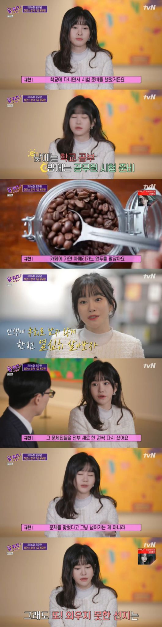 그뿐만 아니라 김규현 주무관은 한 학기 휴학이 끝난 후에는 학업과 수험 생활을 병행했다고 말했고, 잠을 제대로 자지 못 하는 상황에서 커피 원두 가루를 생으로 먹으며 공부해 건강에 문제가 생기기도 했다고 고백했다.