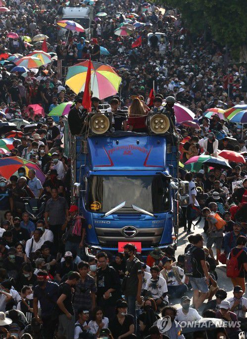 방콕 도심 가득 메운 태국 반정부 시위대(방콕 EPA=연합뉴스) 태국 반정부 시위대가 14일(현지시간) 1973년 10월 14일 민중봉기 47주년을 맞아 수도 방콕 도심을 행진하고 있다. 시위대는 쁘라윳 짠오차 총리 퇴진과 군주제 개혁 등을 촉구했다. jsmoon@yna.co.kr <저작권자(c) 연합뉴스, 무단 전재-재배포 금지>