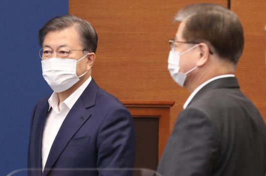 문재인 대통령과 서훈 국가안보실장 (서울=연합뉴스) 김주성 기자 = 문재인 대통령이 12일 청와대에서 열린 수석·보좌관 회의에 참석하고 있다. 오른쪽은 서훈 국가안보실장. 2020.10.12 utzza@yna.co.kr/2020-10-12 14:41:44/ <저작권자 ⓒ 1980-2020 ㈜연합뉴스. 무단 전재 재배포 금지.> |