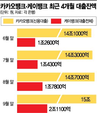 신용대출이 대부분을 차지하는 케이뱅크의 지난달 말 전체 대출 잔액은 2조1100억원으로 8월 말(1조7800억원)에 견줘 3300억원 증가했다. 카카오뱅크와 마찬가지로 8월(3500억원)에 대비하면 증가폭이 소폭 줄었으나 7월(1700억원)에 견주면 2배 가까이로 늘었다.