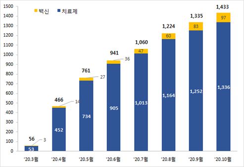 전체 임상시험 1433건 중 코로나19 치료제 임상시험은 1336건, 백신 관련은 97건이다. 연구주체별로는 공익 목적의 연구자 임상시험이 887건, 제약사 임상시험 502건, 정부 주도 임상시험은 45건 등이다.