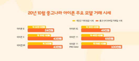 주요 아이폰 모델의 2020년 3분기 중고나라 플랫폼 내 개인간 중고거래 평균 시세는 △아이폰8 약 22만6천원 △아이폰X는 약 30만3천원 △아이폰XR은 약 32만원 △아이폰XS는 약 35만8천원 △아이폰11은 약 45만6천원 △아이폰11 pro Max는 약 58만4천원으로 조사됐다.