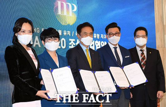 [더팩트ㅣ임영무 기자] 박세연 세라핌디벨롭먼트 개발총괄이사, 김소영 세라핌디벨롭먼트 대표이사, 정장선 평택시장, 최경수 인터콘티넨탈 호텔 그룹 한국개발 대표, 전영기 인터콘티넨탈호텔그룹 한국지역 총괄 총지배인(왼쪽부터)이 15일 오전 서울 강남구 삼성동 인터콘티넨탈호텔에서 열린 '평택시 IHG 5성급 호텔 유치, 국제 관광 휴양지구 MOA 2020 조성사업협약식'에서 협약서 서명후 기념 촬영을 하고 있다.