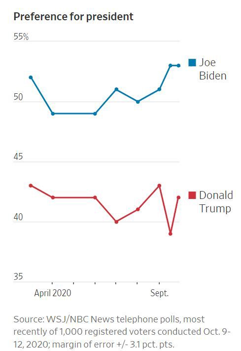 14일(현지시간) 월스트리트저널(WSJ)에 따르면 WSJ와 NBC의 공동 여론조사 결과, 바이든 전 부통령 지지율은 53%로 트럼프 대통령의 42%를 11%포인트 앞섰다. 이번 여론조사는 지난 9~12일 유권자 1000명을 대상으로 했으며 표본오차는 ±3.1%포인트다.