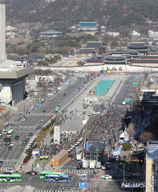 [서울=뉴시스 조수정 기자 = 신종 코로나 바이러스 감염증(코로나 19)가 전국적으로 확산세를 보이는 가운데 23일 감염병 관리 관련 법률 등으로 집회 시위가 금지된 서울 광화문광장에서 전광훈 목사가 이끄는 문재인하야범국민투쟁본부 회원들이 집회를 하고 있다. 2020.02.23. chocrystal@newsis.com |