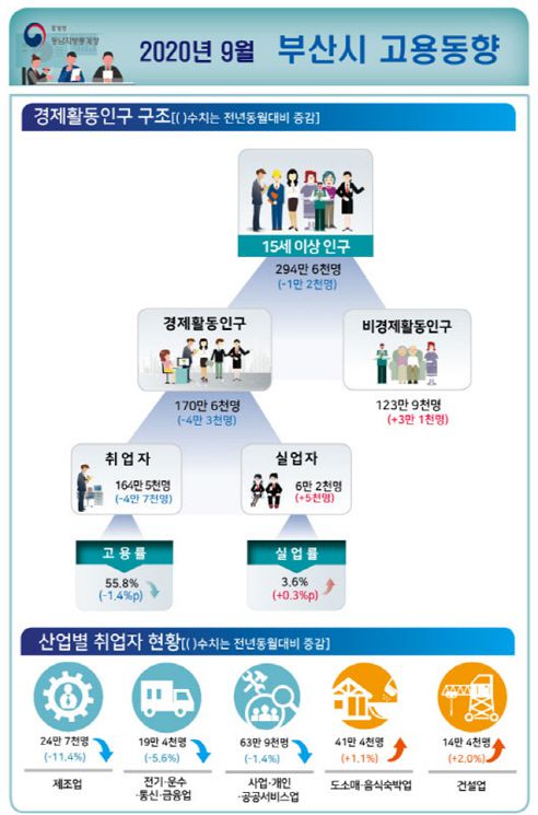동남지방통계청이 16일 발표한 9월 부산 고용동향을 보면 부산지역 취업자는 164만5,000명으로, 지난해 같은 달에 비해 4만7,000명(-2.8%) 감소했다.