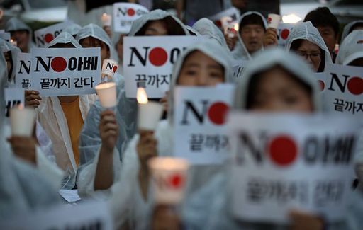 지난해 8월 초 일본이 수출심사우대국(화이트리스트) 명단에서 한국을 제외하자 수많은 시민들이 모여 아베 정권을 규탄했다. 사진은 '일본대사관 앞 시민 촛불 발언대'에서 참가자들이 구호를 외치는 모습. 연합뉴스 |