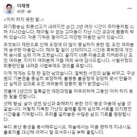 이 지사는 이날 자신의 페이스북에 ‘미처 하지 못한 말’이라는 글을 통해 “파기환송심 최종선고가 내려지던 순간, 2년여의 시간이 주마등처럼 스쳐 지나갔다”며 “헤아릴 수 없는 고마움이 지난 시간 곳곳에 촘촘히 박혀 있다. 아픈 기억은 멀어지고 미안한 마음만 남아 있다”고 소회를 남겼다.