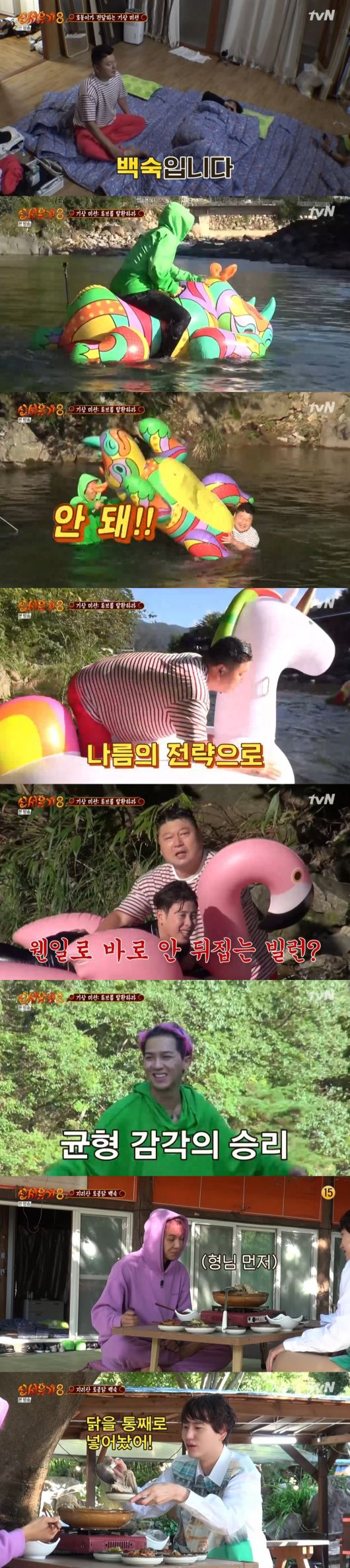이후 불굴의 의지로 피오가 홍학에 탑승했지만 강호동이 피오와 동반 탑승하려다가 둘다 물속으로 입수해 웃음을 샀다. 이이서 규현은 유니콘에 안정적으로 탑승했고 민호 역시 튜브에 올라타서 미션에 성공, 지리산 토종닭 백숙을 맛있게 먹었다.