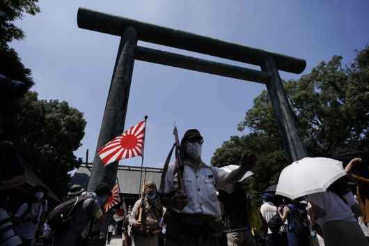 구일본군 육군과 해군복을 입은 사람들이 8월 15일 일본 도쿄 야스쿠니신사 인근을 행진하고 있다. 도쿄/AP뉴시스 |