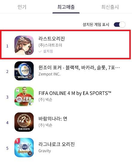스마트조이의 모바일 게임 '라스트 오리진'이 원스토어 매출 1위를 탈환했다. 향후로도 주요 업데이트마다 상위권 순위를 되찾으며 안정적 인기를 이어갈 것으로 전망된다.