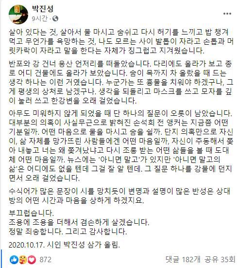 박진성은 "반포와 강 건너 용산 언저리를 떠돌았다. 다리에도 올라가 보고 종로 어디 건물에도 올라가 보았다"면서 "누군가는 또 흉물을 치워야 하겠구나, 그게 평생의 상처로 남겠구나. 생각을 되돌리고 마스크를 쓰고 모자를 깊이 눌러 쓰고 한강 변을 오래 걸었다"고 했다.