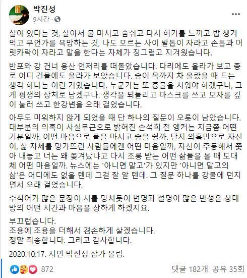 우선 박씨는 “반포와 강 건너 용산 언저리를 떠돌았다. 다리에도 올라가 보고 종로 어디 건물에도 올라가 보았다”면서 “누군가는 또 흉물을 치워야 하겠구나, 그게 평생의 상처로 남겠구나. 생각을 되돌리고 마스크를 쓰고 모자를 깊이 눌러 쓰고 한강 변을 오래 걸었다”는 심경을 밝혔다.