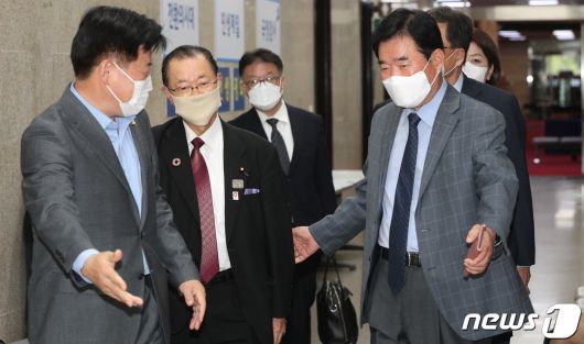 (서울=뉴스1) 신웅수 기자 = 가와무라 다케오 일한의원연맹 간사장이 18일 오후 서울 여의도 국회에서 이낙연 더불어민주당 대표와 비공개 면담을 하기 위해 김진표 의원의 안내를 받아 당대표실로 향하고 있다. 2020.10.18/뉴스1