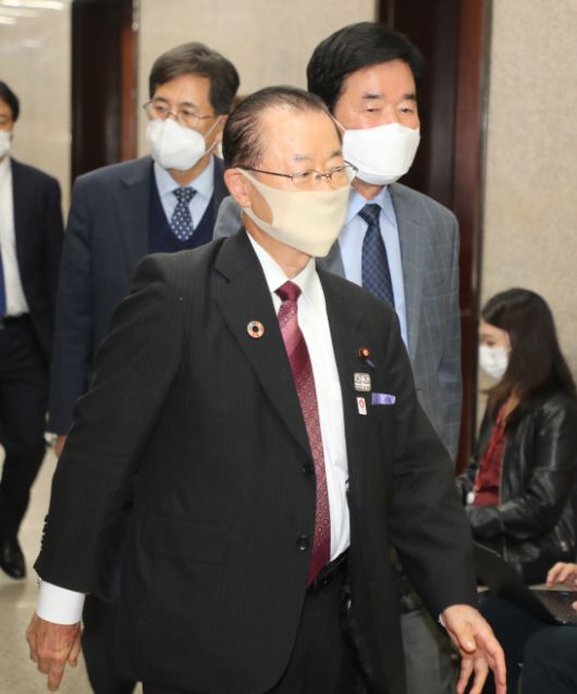 스가 요시히데 일본 총리 측근인 가와무라 다케오 간사장이 18일 오후 더불어민주당 이낙연 대표와 비공개 면담을 갖기 위해 한일의원연맹 회장인 김진표 의원의 안내를 받으며 국회 본청 민주당 당대표실로 향하고 있다./연합 |