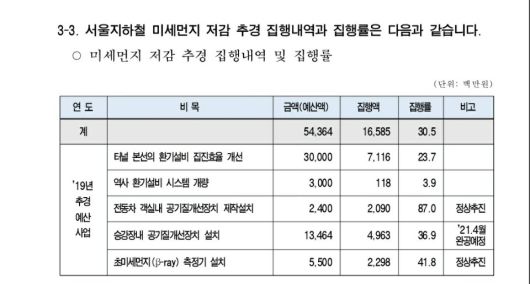 19일 오 의원이 서울시로부터 받은 지하철 미세먼지 저감 추경 집행내영과 집행률을 보면 평균 집행률은 30.5%지만, 세부 내역에선 ‘역사 환기설비 시스템 개량’ 집행률은 3.9%에 불과하고, ‘터널 본선의 환기설비 집진효율 개선’은 23.7%에 불과했다.