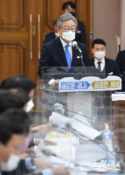 이재명 경기도지사가 19일 오전 경기도 수원시 팔달구 경기도청에서 열린 국회 행정안전위원회의 경기도에 대한 국정감사에서 업무보고를 하고 있다. (사진공동취재단)