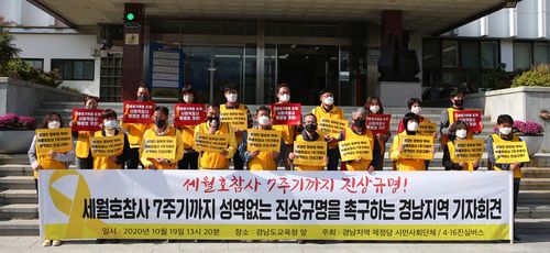 4·16 세월호참사 가족협의회와 경남지역 제정당 시민사회단체는 이날 경남도교육청 앞에서 기자회견을 열고 "세월호 참사 7주기까지 성역 없는 진상규명과 책임자 처벌 약속을 이행하라"고 촉구했다.
