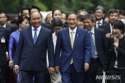 [서울=뉴시스] 김예진 기자 = 베트남을 방문중인 스가 요시히데(菅義偉) 일본 총리가 응우옌 쑤언 푹 베트남 총리와 회담을 가지고 안보 분야 등에서 협력을 확인했다.