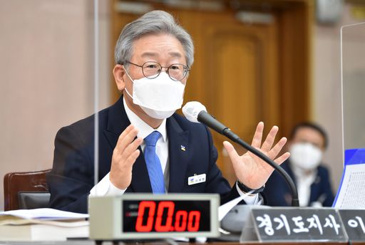 이재명 경기도지사가 19일 경기 수원시 팔달구 경기도청에서 열린 국회 행정안전위원회의 경기도 국정감사에서 의원 질의에 답변하고 있다. 수원=뉴시스 |
