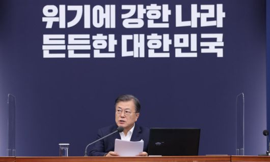 앞서 문 대통령은 지난 12일 수석보좌관회의에서 회의 구호를 언급하기도 했다. 문 대통령은 당시 “전 세계적 코로나 위기 속에서 우리는 방역과 경제 모두에서 강한 면모를 보여주며 ‘위기에 강한 나라, 대한민국’으로 국가적 위상이 높아지고 있다”고 했다.