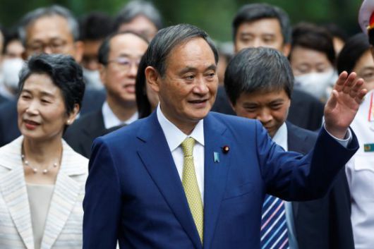 베트남을 방문 중인 스가 요시히데 일본 총리가 19일 하노이 대통령 궁을 방문하며 손을 흔들고 있다. 로이터뉴스1 |