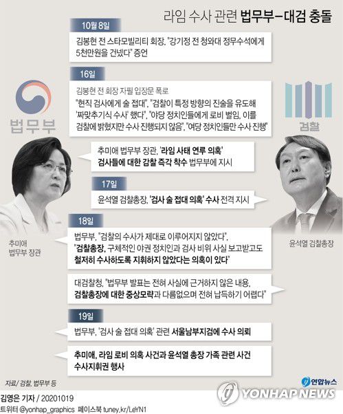 앞서 법무부는 전날 라임 사건의 '몸통'인 김봉현 전 스타모빌리티 회장을 직접 조사한 결과 윤 총장이 야권 정치인과 검사 비위에 대해 구체적으로 보고받고도 여권 인사와는 달리 철저히 수사하도록 지휘하지 않았다는 의혹이 있다고 발표했다.