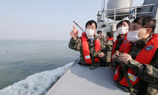 더불어민주당 소속의 민홍철 국회 국방위원장(왼쪽)과 국민의힘 이채익 의원(오른쪽) 등 국회 국방위원들이 19일 인천 옹진군 연평면 소연평도 인근 해상에서 지난달 북한군의 총격에 사망한 공무원에 대한 수색 작업 현장을 확인하고 있다. 연평도=국회사진기자단 |