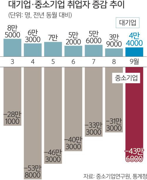 반면 지난달 종사자 300인 이상 대기업의 취업자는 269만8000명으로 전년 동월 대비 4만4000명 늘었다. 대기업 취업자는 증가 폭이 다소 줄긴 했지만, 올해 들어 계속 증가세를 보였다. 지난달 중소기업 취업자가 지난해 같은 달보다 43만5000명 줄었는데 대기업 취업자가 4만4000명 증가해 그나마 전체 취업자 감소 인원이 39만2000명으로 맞춰진 셈이다.