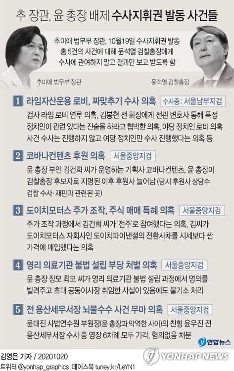 (서울=연합뉴스) 민경락 기자 = 추미애 법무부 장관이 19일 수사지휘권을 발동해 윤 총장에게 수사에 관여하지 말고 결과만 보고 받도록 한 사건은 총 5건이다.