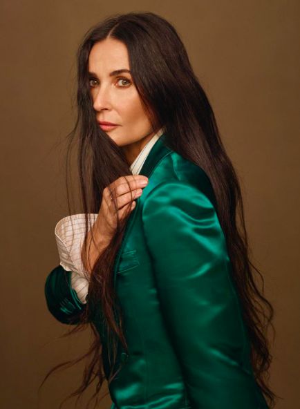 데미 무어는 19일(현지시간) 자신의 SNS에 본인의 모습을 담은 사진 한 장을 게재했다. 사진 속 데미 무어는 빛나는 초록색 슈트 정장을 입은 채 포즈를 취하고 있다. 풀어놓은 머리는 허리를 넘어 엉덩이 아래로 내려오는 긴 길이를 자랑한다. 이 같은 긴 머리는 데미 무어의 트레이드 마크이기도 하다.