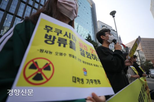 20일 '대학생 기후행동 서포터즈' 회원들이 서울 종로구 옛 일본대사관 건너편에서 일본의 후쿠시마 방사능 오염수 방류 발표를 비판하고 이를 철회할 것을 요구하는 기자회견을 열고 있다. 이들은 기자회견에서 방사능 오염수 방류는 지구와 인류에 대한 범죄이며 일본이 정상적인 국가로 인류 공동체의 일원이 되기 위해서는 국제원자력기구, 유엔 인권회의 등 국제 공동 조사 기구를 만들어 후쿠시마 핵발전소 방사능 폐기물에 대한 공동 조사를 받아야 한다고 말했다.