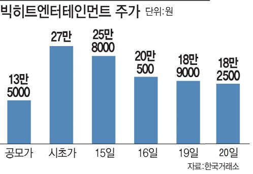 20일 빅히트의 주가는 전 거래일 대비 3.44% 떨어진 18만 2500원에 장을 마쳤다. 빅히트는 이날로 상장 나흘째인데, 상장 첫날 시초가 대비 하락 마감한 것에 이어 나흘 내내 하락 마감했다. 심지어 이날은 장 한 때 17만 6000원까지 하락하면서 18만원선이 깨지기도 했다.