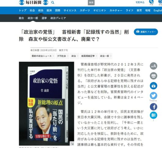 [서울=뉴시스] 스가 요시히데(菅義偉) 일본 총리의 저서 '정치가의 각오' 개정판에서 공문서 관리의 중요성에 대한 내용이 삭제돼 논란이 일고 있다고 마이니치신문이 20일 보도했다.(사진출처: 마이니치신문 홈페이지 캡쳐) 2020.10.20. |