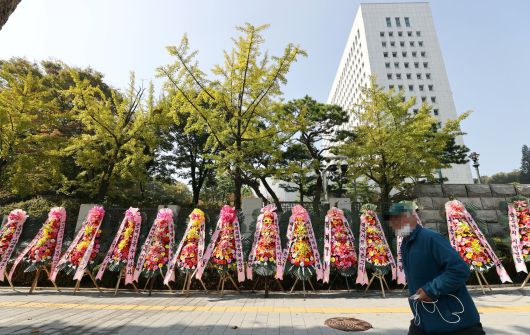 20일 오후 서울 서초구 대검찰청 정문 앞에 검찰 응원 화환이 놓여있다. 연합뉴스 |
