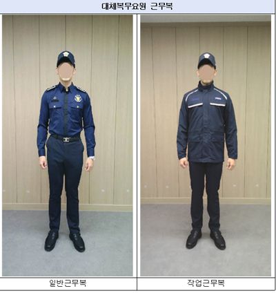 하루 8시간 근무를 원칙으로 하고 업무 중에는 근무복을 입어야 한다. 대체복무요원의 근무복은 교도소 직원과 똑같지만 모자에 '대체복무'를 기재해 겉으로 구분되게 했다. 보수는 복무기간별로 현역병 기준에 맞추고, 급식은 교정공무원과 동일하게 제공된다.