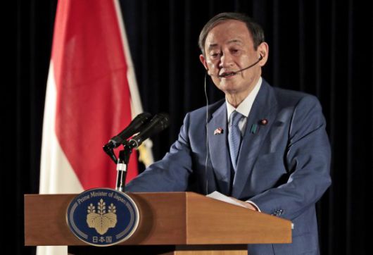 인도네시아를 방문 중인 스가 요시히데 일본 총리가 21일 자카르타에서 기자회견을 하고 있다. AP뉴시스 |