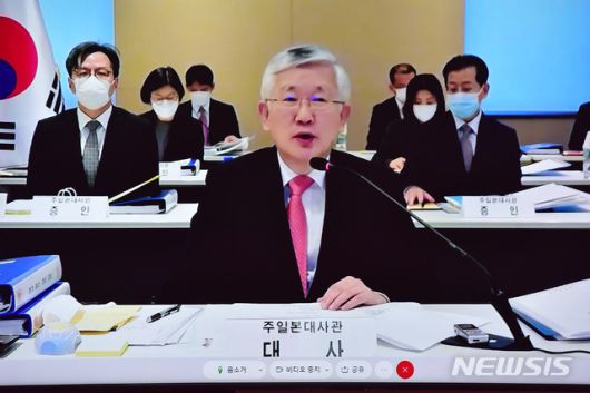 [서울=뉴시스] 김진아 기자 = 남관표 주일대사가 21일 오전 서울 여의도 국회에서 열린 외교통일위원회의 주일대사관, 주중대사관에 대한 화상 국정감사에서 의원들의 질문에 답변하고 있다. (공동취재사진) 2020.10.21. photo@newsis.com |